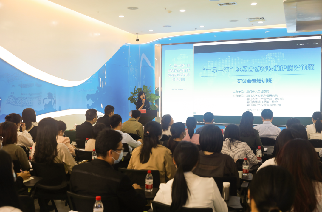 知产院讯 2022年11月23日下午,由厦门市人民检察院主办,厦门市商标(品牌)协会承办,厦门大学知识产权研究院、厦门大学“一带一路”研究院、厦门知识产权投资有限公司协办的“一带一路”经贸合作商标保护前沿问题研讨会暨培训班在厦门自贸区内知识产权 CBD一楼成功举办。我院林秀芹院长、朱冬副教授、董慧娟副教授、李晶助理教授、杨正宇助理教授参与本次研讨会暨培训班并发表讲话。