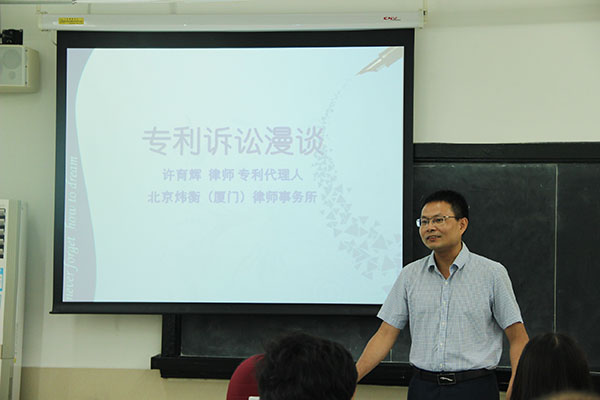 知产院讯(记者 胡瑄瑄报道)6月3日上午,北京炜衡(厦门)律师事务所许育辉律师在我院B322教室与学生举行题为“专利诉讼漫谈”的实务讲座。许律师同时担任我院兼职硕士生导师,拥有律师执业证书和专利代理人执业证书。出席本次实务讲座的师生有我院乔永忠副教授、罗立国助理教授,及我院在校研究生们。
